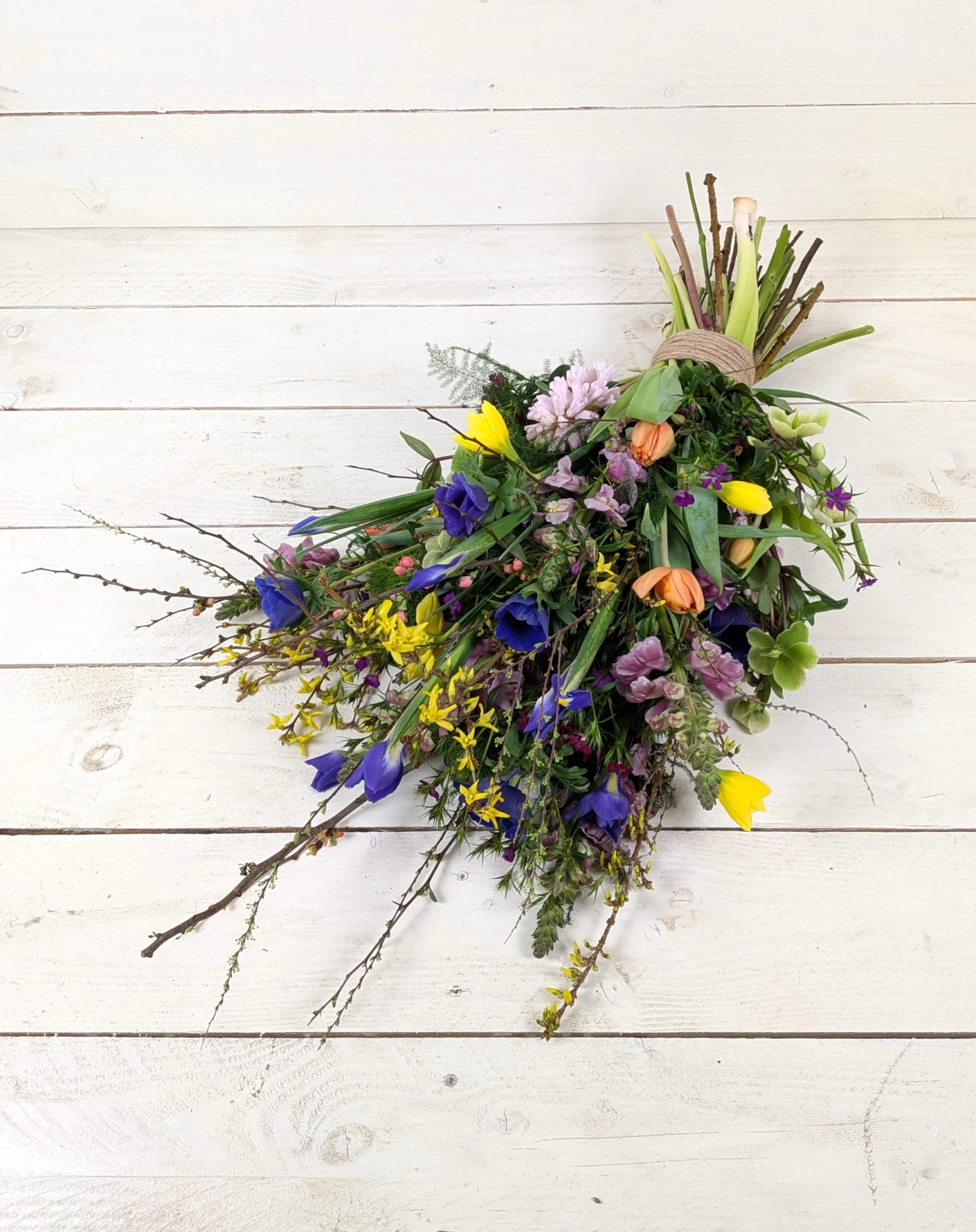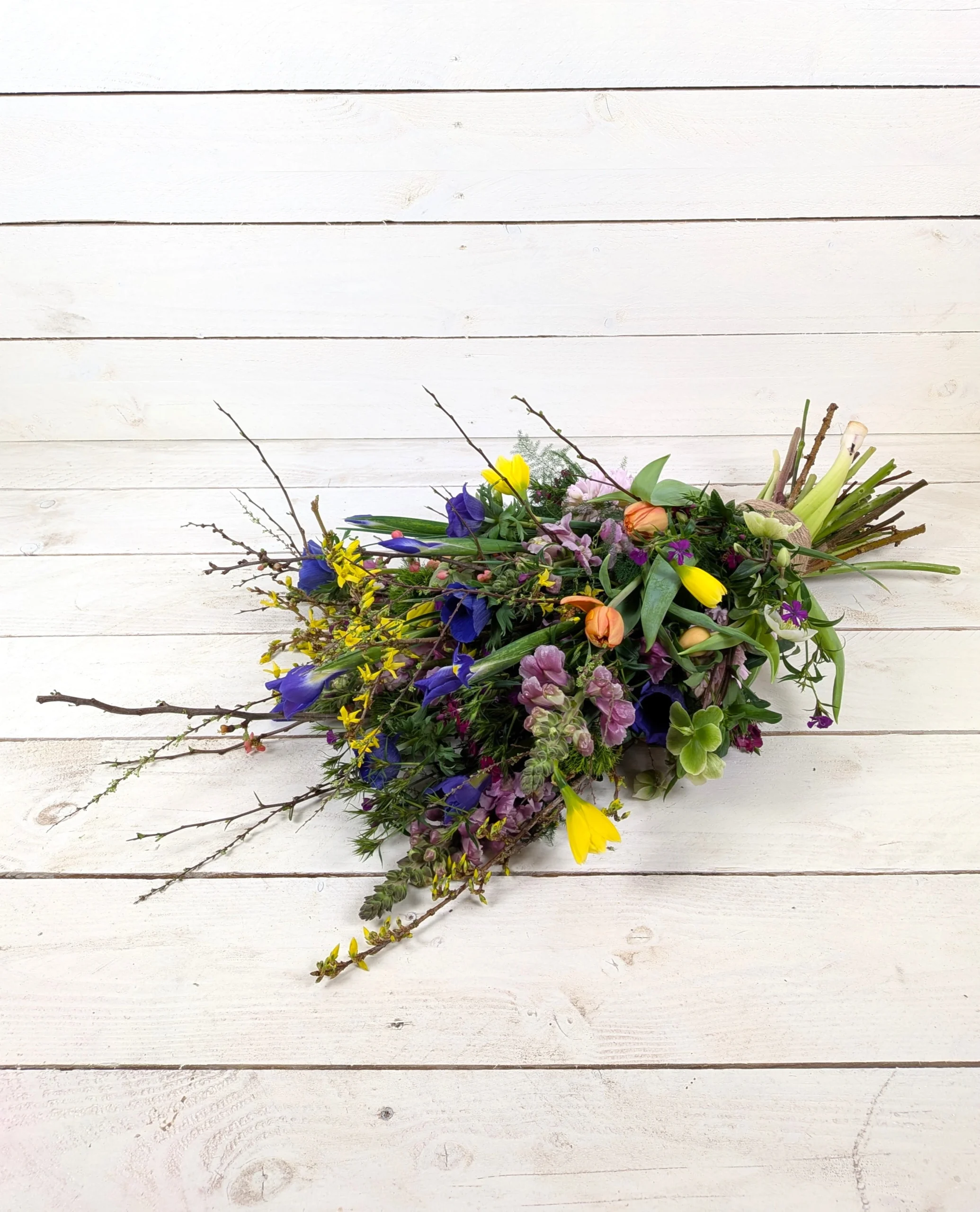 Liggend rouwboeket met een zachte, natuurlijke uitstraling. Gemaakt van duurzaam geteelde seizoensbloemen uit eigen kwekerij.