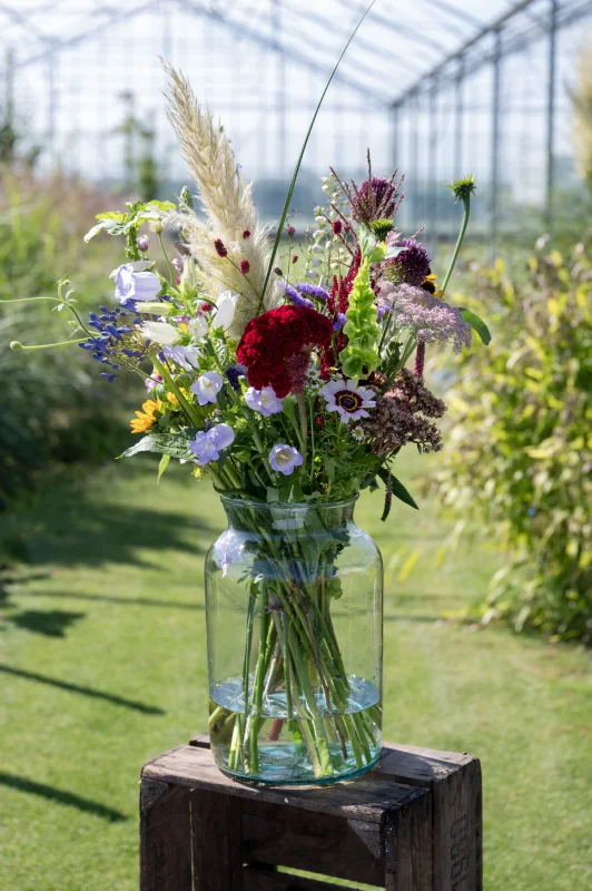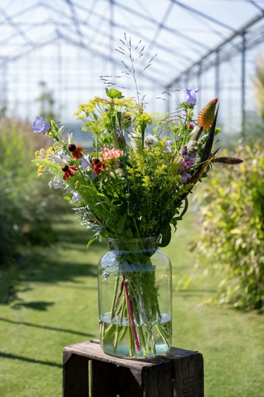 Kies voor een fleurig boeket van unieke, lokale, duurzame geteelde bloemen uit het seizoen. Ieder seizoen wisselend van samenstelling en daardoor altijd verassend! Het plukboeket groot bestaat uit 25 – 30 stelen.